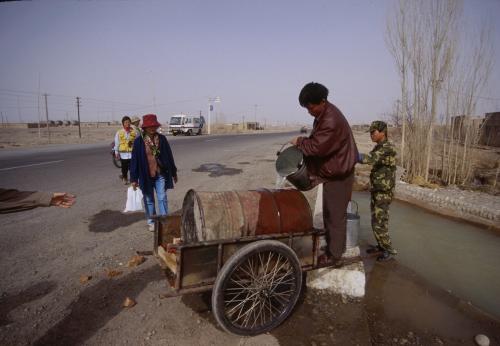 水道設備の整っていない地域では、ドラム缶を利用した容器で水路から水を運ぶ光景を目に
