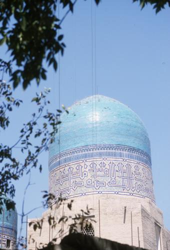 古都サマルカンドは、青いタイルが美しいモスクが数多くある。ビビハニム・モスクのドウムもそのひとつ。 建設を急かせたチムールの望み通り、チムールの死の1年前の1404年に完成した。しかし、急いだ建設 が原因か、ひとつ、またひとつとレンガが崩れ落ち、礼拝する人がいなくなった。荒廃していたが、1974年 より修復作業が続けられている。