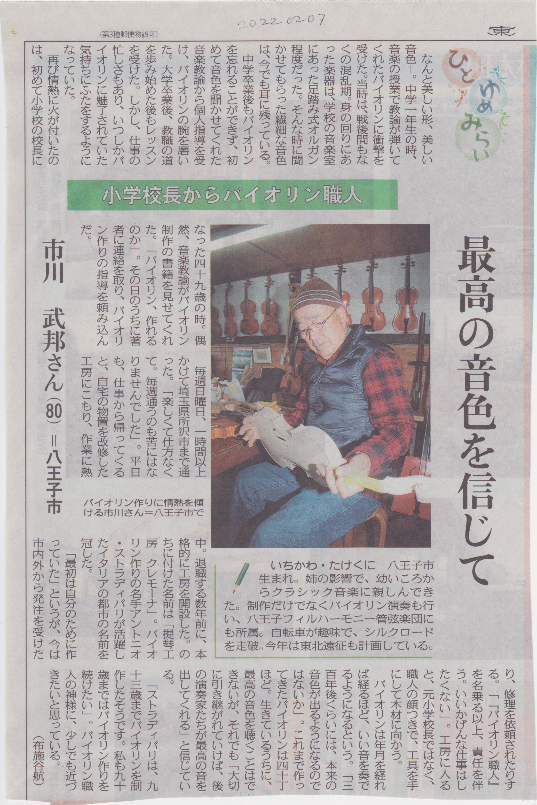 | 市川武邦さん(クリックで詳細へ) の小学校長からバイオリン職人へ 「最高の音色をもとめて」東京新聞記事 |