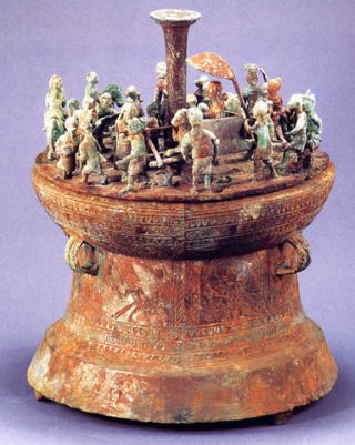 『祭祀貯貝器』 前漢時代のもの。中央に高い柱が立っている。乗り物に乗った貴婦人は祭りの中心人物なのだろう、金メッキを施している。卑弥呼のような存在なのか。傘を持つ従者、乗り物を担ぐ4人。合計35人が登場しているが、面白いのは祭祀に直接関係していない人たちを描いているところだ。農作物、瓜や果物らしいものを入れた籠。人が集まるところでの交易活動をリアルに表現している。高さ40センチ、蓋の直径28センチ。 |