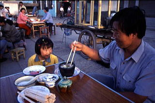 ところで夕食は、約10人ごとに円卓を囲んで食事をするのだが、連日10品以上もの中華料理がテーブルに並ぶ。中華料理が好きといっても、豚肉、油たっぶりの料理の連続でちょっと食傷ぎみであった。 それでもこの日は、体力の消耗が激しかったと見えて、みんな食欲旺盛だ。昼間からビールが出たこともあってか、どのテーブルも盛りあがり、明るいうちからにぎやかな宴会が始まった。これもまた、中年探検隊の楽しみの一つだ。 |
