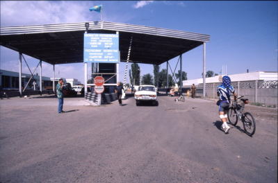 ビシケクの街は20分ほどで通り過ぎた。左手のはるか遠くには、万年雪をいただいたパミール高原の山並みを望み、草原を走った。さすがにイラン、トルクメニスタン、ウズベキスタン、カザフスタン、キルギス、さらに中国の新疆ウイグル自治区へとつながる幹線道路。中央アジアを横断するだけに交通量は多い。 翌日の8月8日。30qほど走ると、カザフスタンとの国境に到着した。アイスクリームを食べたりして、キルギスのスタッフが行ってくれる手続きが終わるのを待った。―時間ほどで手続きは終了した。中国からキルギスへの国境越えとはずいぶん違う。簡単だ。国境の警備員の指示に従って、自転車を押して通過した。国境から30キロメートルほど走って宿泊地のメルケに到着することができた。 |