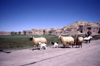 キャラバンサライの遺跡が、繰り返し何度も道路わきに出現するイランの砂漠を走る トマトと卵を炒め、ナンにのせて道路脇で朝食。車の往来はほとんどない。 7時40分に出発、900メートルと800メートルの間をアップダウンを繰り返した。9時40分、気温は20℃となり、往来する車が急に増えた。マシェッドに入ったのだ。 マシェッドからは高速道路に入った。路面は快適だ。路肩も十分広く安心してペダルを踏んだ。しかし、アップダウンを繰り返す道路と強い向かい風。上りでは時速10キロメートル。下りはペダルを踏んでも時速15キロメートル。気温は33℃前後だったが、向かい風には叶わない。150キロメートル走行。トルクメニスタンのビザ取得で手間取った日程をカバーするために150キロメートルを車で移動。トルバット・ヘダリーで宿泊した。 |