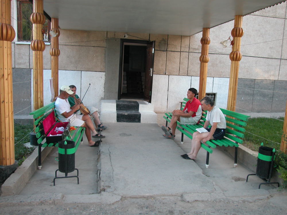 | NarynのGuest Houseでくつろぐ隊員達。左側市川武邦隊員、ビクトル運転手、右側小笠原庄次隊員、ジャニベックガイド兼通訳。 市川武邦さんはKashgarの楽器店で念願の楽器”フシタル”(ウズベク語で”楽しむ”)を購入したのでここでロシア民謡等を演奏し午後の休息時をジャニベックガイドやビクトル運転手と共に楽しんだ。 |