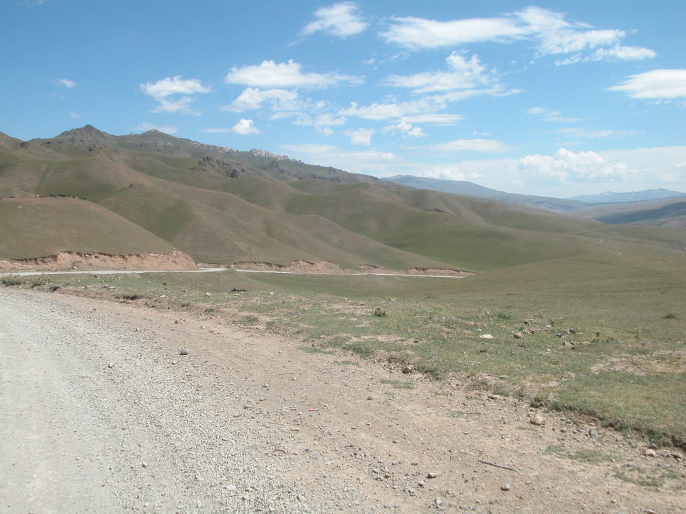 | Dolon Pass(3038m)から見た、我々が上ってきた道。Dolon Passで売っていたものはウオッカと馬乳酒とヨーグルト玉(ヨーグルトを乾燥させ、塩を入れて球状に固め乾燥させたもの)。飲酒運転奨励か。 Dolon Passは峠らしい峠でした。 |