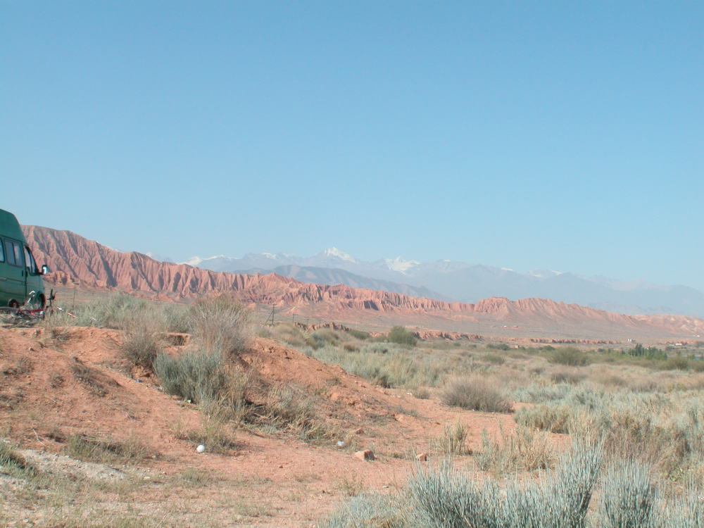 | 左を見ればこの雪山。方向的には我々が走行してきたTorugart、Dolon Pass方向です。 |