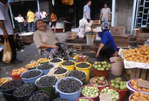 ビシケクのバザールでは、ブルーベリー、イチゴなどの果物が豊さを伝えている。イチジク、