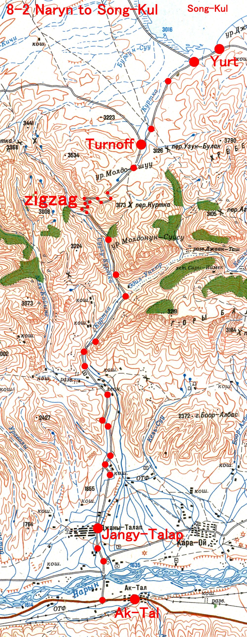 | Naryn周辺の地図です。我々のルートは東西に走り赤い丸で記してあります。 Narynから北に行くとDolon Passを越えてIssyk-Kulに行きます。 Narynから南に行くと天山山脈のTorugart Passを越え、Kashgarに行きます。Torugart PassからKashgarまで約160kmですが、最初の100kmは自転車走行させてくれません。Torugart Passに行く道は天山山脈のすぐ近くを通るので素晴らしい雪山の景色が見られます。また、近くにはTash-Rabat、Chatyr-Kul等景色の良いところがあります。 Narynはソ連邦の時代にはこの地方の中心都市として発展させるよう計画されていましたが、現在はあまり発展していない感じです。トロリーバスも見かけなくなり、Internet屋も閉店されていました。しかし、この地方の中心都市であることは間違いありません。 |