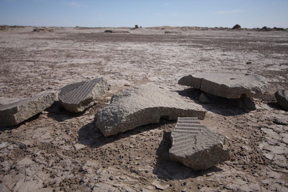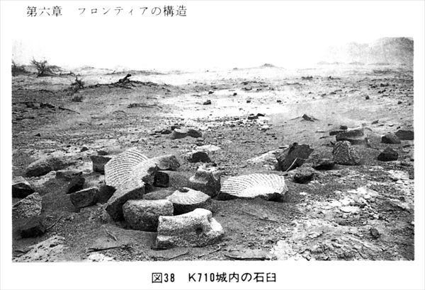 降ろされた場所は砂漠のなかかと思われたがよく見ると違っていた。草や木の枝で固められた土塁がいくつも目に入る。これらは間違いなく建造物だったのだろう。歩き回ると陶器の欠片が散らばっている。少し行くと石臼と思われるものもある。両手で持ち上げようとしても動かない。ここはむかし、屯田兵の生活空間だったのではあるまいか。